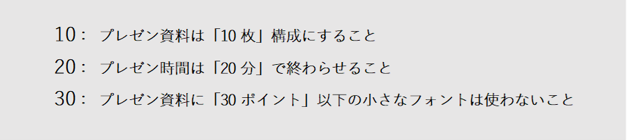 「10/20/30の法則」とは元アップル社エバンジェリストのガイ・カワサキさんが最も効果的なプレゼンテーションの方法として提唱した法則になります。