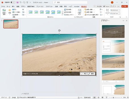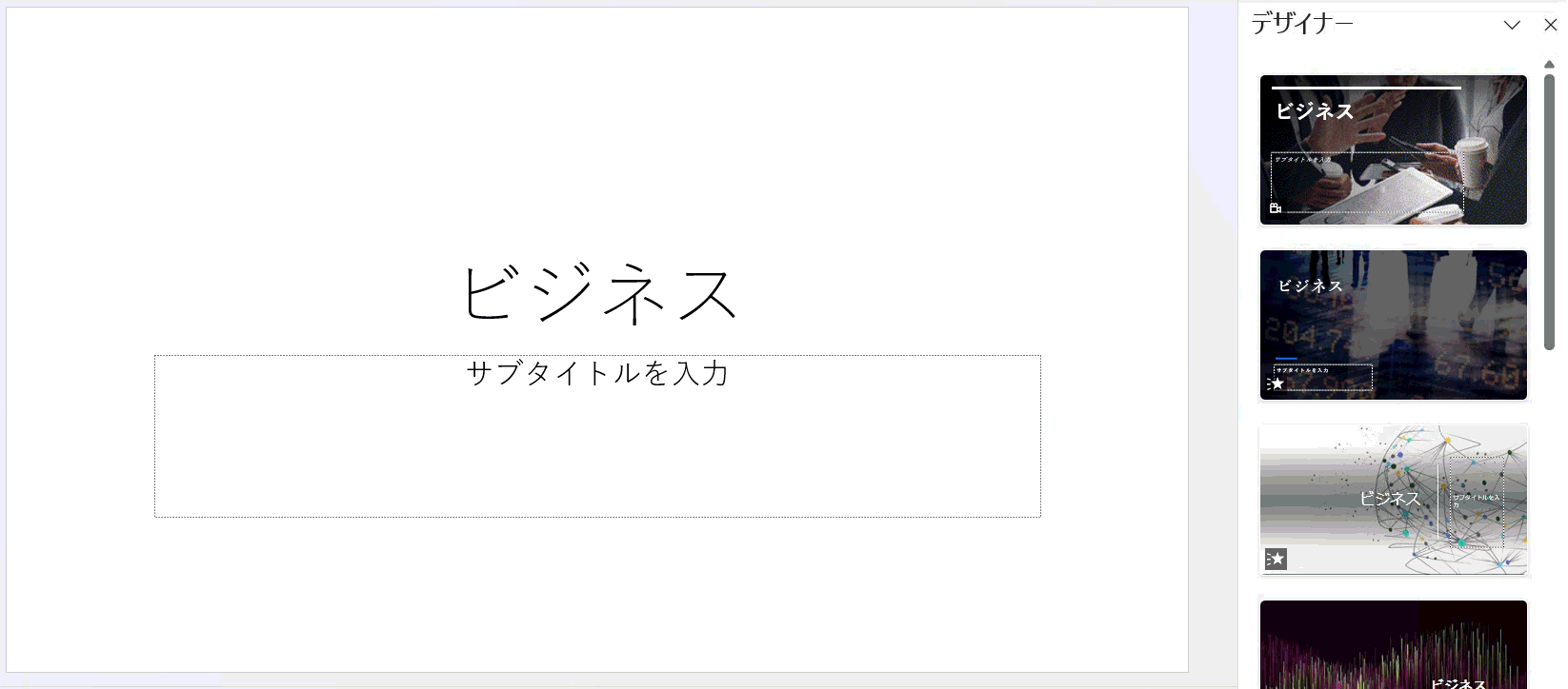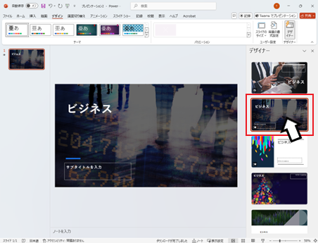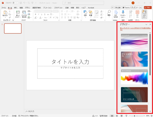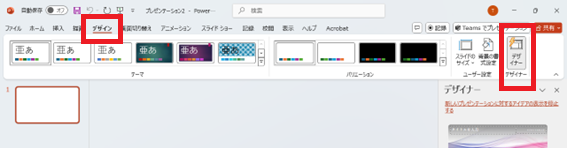テーマの種類はPowerPointに標準で付属しているテーマを使用してください。外部からダウンロードしたテーマでは、デザイナー機能が動作しない場合があります。