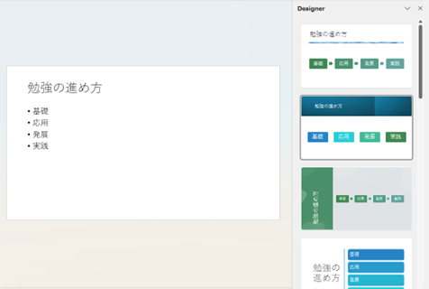 デザイナー機能とは、スライドに入力されたテキストや画像をAIが分析し、その内容に最も適したデザインを自動で提案してくれる機能です。