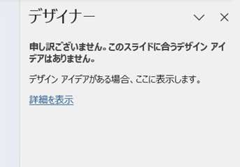 テキストを入力する前または画像を挿入前に図形のみ挿入するとデザイン候補が表示されません。この後にテキストの入力、画像の挿入を行ってもデザイン候補が表示できないことが多いです。
