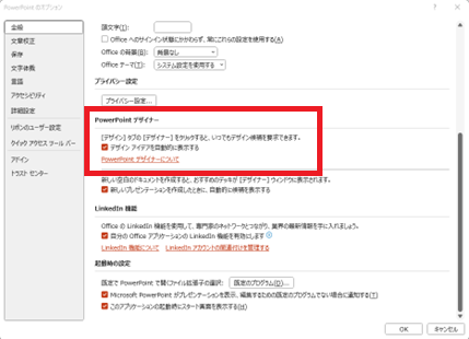 自動で起動しない場合は「ファイル」タブ→「オプション」→全般→PowerPointデザイナーの「デザイン アイディアを自動的に表示する」にチェックを入れます。