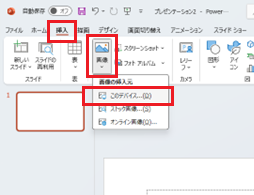続いては画像を挿入してみましょう。PCに保存されている画像を挿入する場合は「挿入」タブ→「画像」グループにある「画像」をクリックし表示された一覧の中から「このデバイス」をクリックします。