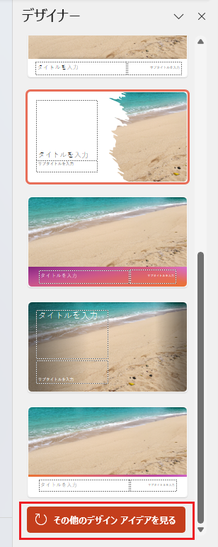 お好みのデザインがない時は、「デザイナー」作業ウィンドウの一番下に「その他のデザイン アイディアを見る」をクリックするとさらにデザインを表示することが出来ます。